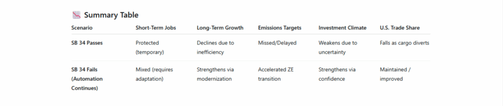 If SB 34 passes, it could slow capital investment and delay the rollout of advanced zero-emission systems that depend on grid power—reducing yard efficiency and extending equipment life cycles. If vetoed, automation and electrification will likely accelerate, supported by public and private funding but paired with renewed scrutiny over how modernization benefits the workforce. Either way, California’s ports face the same long-term challenge: balancing technology, labor, and climate mandates while keeping America’s busiest gateways competitive.