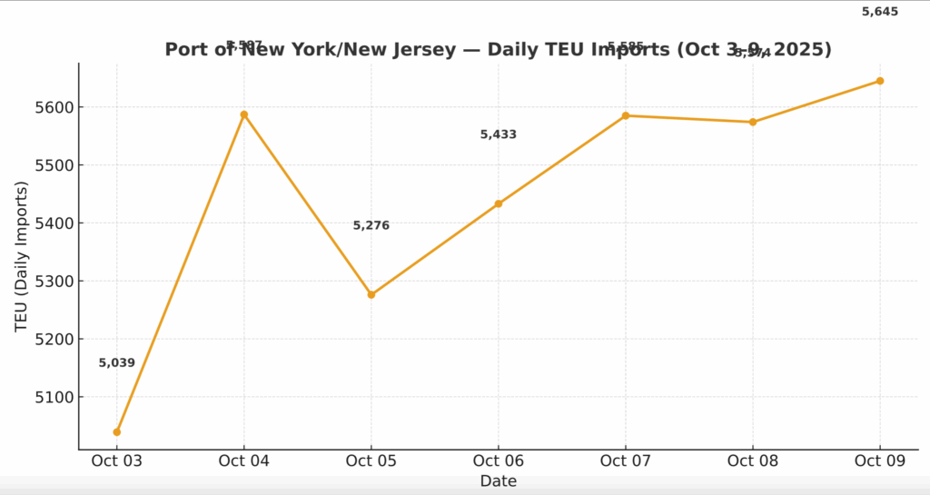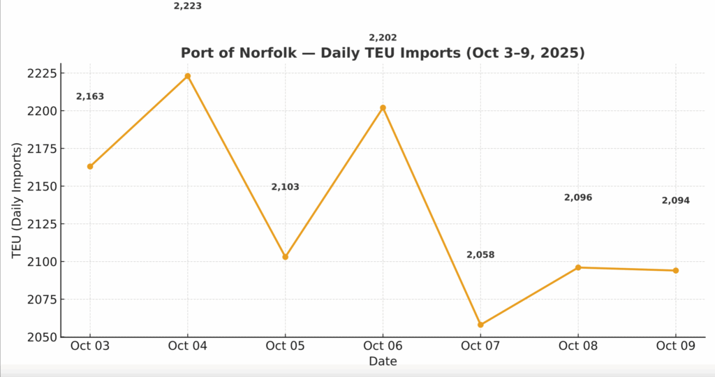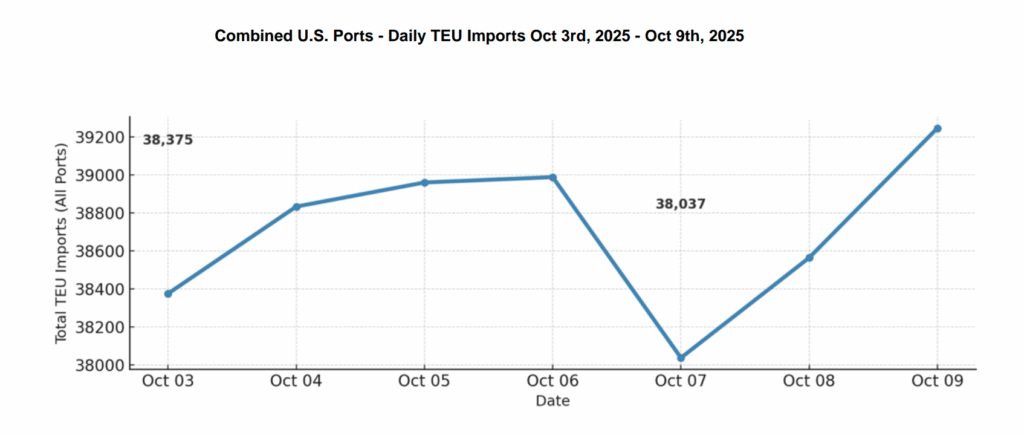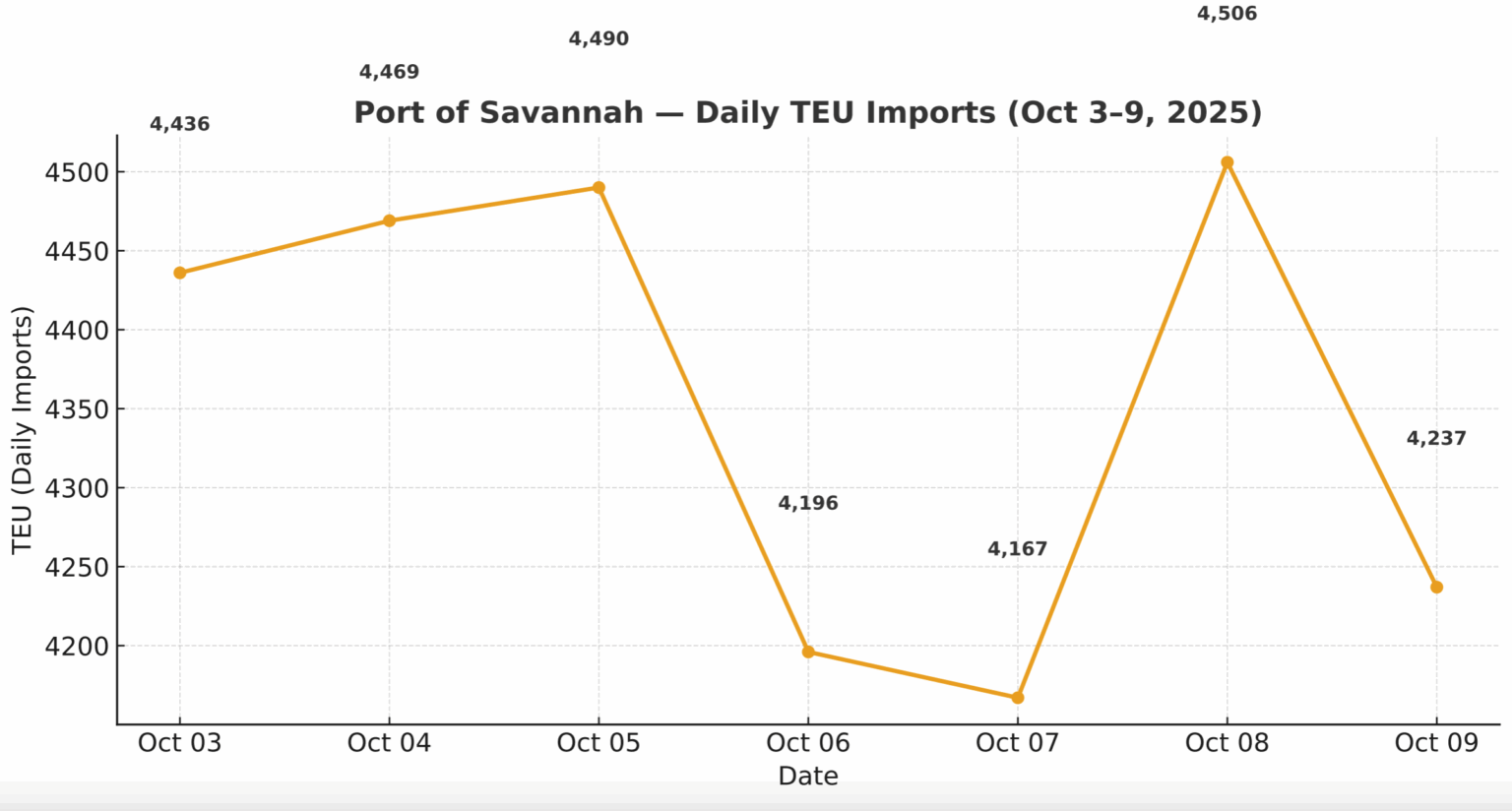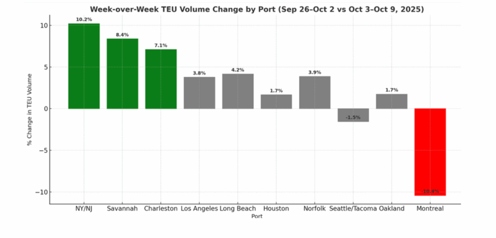 While the headlines center on strikes and shutdowns, container flows keep moving — just not always where you’d expect. U.S. import TEUs climbed another 6.9% week-over-week, continuing a late-season surge driven by restocking and pre-holiday bookings ahead of tariff uncertainty. The biggest jumps came through NY/NJ (+10.2%), Savannah (+8.4%), and Charleston (+7.1%), as shippers diverted cargo from Montreal and West Coast gateways toward East Coast reliability. Los Angeles and Long Beach volumes were modestly higher (+3.8% and +4.1%, respectively), reflecting steady Transpacific flows — but analysts expect a potential softening if the shutdown continues to slow customs and FDA clearances. Some inland rail hubs are also reporting longer dwell times and inconsistent chassis availability, a byproduct of both East Coast rerouting and delayed returns. Carriers continue adjusting network capacity to match these shifts, with some short-term reallocation of sailings from Canadian and Northern routes toward the U.S. South Atlantic. The result is a rare late-Q4 imbalance: higher TEU throughput on the East Coast even as West Coast rates flatten.