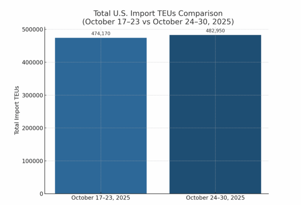 TEU’s are up 1.85% over last week, with the majority coming into Los Angeles 13%, New York/New Jersey 12.7% and Long Beach 12.5%. Container rates on the major Asia trade lanes climbed sharply in late October as progress on regional trade agreements lifted market confidence and carriers tightened capacity. Freightos data showed trans-Pacific and Asia–Europe lanes rising 15–20%, with spot rates averaging around $2,000 per FEU to the U.S. West Coast, $3,500 to the East Coast, and $2,270 to Northern Europe. Analysts noted that the gains largely held through the end of the month as carriers continued blank sailings to stabilize pricing during the seasonal slowdown. Current rate levels now sit well above pre–Red Sea crisis benchmarks, and additional general rate increases could follow in November if capacity discipline holds, although geopolitical uncertainty in the Middle East continues to temper expectations for smoother global routing through the Red Sea and Suez.