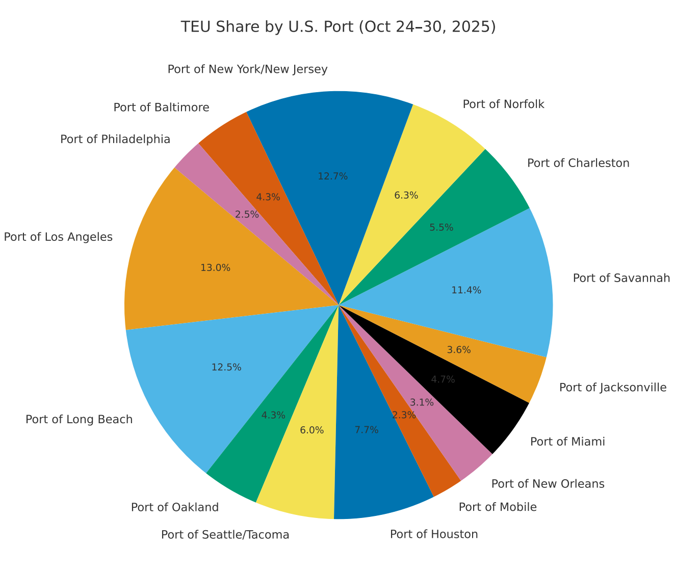 These new trade deals could quietly shift the freight map for 2026. Lower tariffs on South Korean autos and industrial components will likely drive more inbound volume through West Coast and Gulf gateways — especially Long Beach, Houston, and Savannah — where automotive and heavy-equipment traffic is already building. The China tariff pause may take some pricing pressure off importers, but most of that freight is still moving under a cloud of caution — with routing diversification and risk mitigation becoming standard practice. As Southeast Asia strengthens ties with the U.S., expect to see growing TEU flow from Vietnam, Malaysia, and Thailand — countries now positioned as “China Plus One” sourcing hubs.