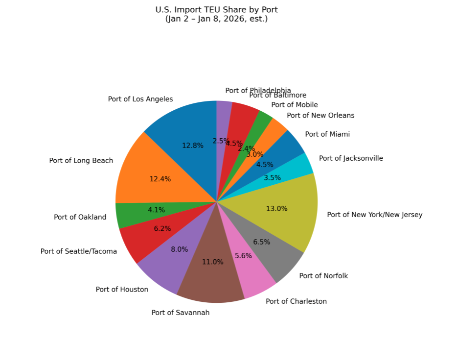 TEU’s are up 4.41% over last week, with majority coming into New York/New Jersey 13%, Los Angeles 12.8%, and Long Beach 12.4%. West Coast ports are entering early 2026 with a rare advantage: soft demand and steady operations. After holding onto the market share gains achieved during 2024’s supply chain reshuffle, Pacific gateways benefited again in 2025 from tariff-driven frontloading and faster Asia transit times. As volumes cooled in the back half of the year, congestion remained limited — a trend that is expected to continue through Q1 2026 as import demand stays muted. Even with sharp demand swings throughout 2025, West Coast gateways proved more resilient than in past cycles. Improved forecasting, tighter coordination across terminals, drayage, rail, and warehouses, and faster truck turn times helped absorb peak summer volumes without triggering prolonged bottlenecks. The result has been a more balanced, predictable operating environment despite uneven cargo flows.