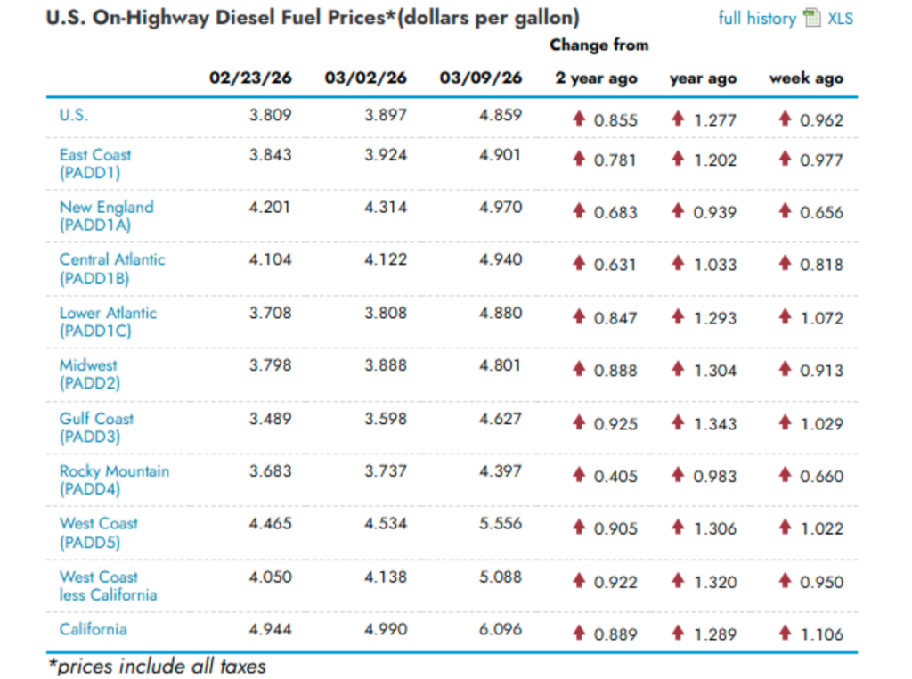 Fuel markets delivered one of the biggest shocks the trucking industry has seen in decades this week, with U.S. diesel prices jumping nearly a dollar per gallon in just seven days. The national average climbed to roughly $4.90 per gallon, according to federal energy data, marking the largest weekly increase since tracking began in the mid-1990s. In some regions, particularly along the West Coast, diesel prices are already pushing above $6 per gallon, dramatically increasing operating costs for trucking fleets. The rapid rise is already moving through the freight market. Fuel surcharges tied to diesel prices have climbed 15–20 cents per mile in many lanes, immediately increasing the cost of long-haul trucking across the country. Because most carrier fuel programs adjust weekly, shippers are likely to begin seeing the impact show up on invoices and brokerage quotes over the coming weeks.