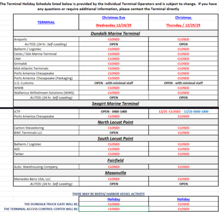 | Norfolk | No | No | Immediate | The Port of Virginia has released its 2025 Christmas/New Year’s Port Operating Plan (12/12). |
