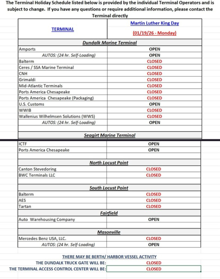 | Baltimore | No | No | Immediate | The port of Baltimore has released its schedule for Martin Luther King Jr. Day (1/19). The Seagirt Marine Terminal main gate hours will be extended until 5:30 PM on the following dates: Wednesday, January 21, Thursday, January 22. No reefer transactions will be processed after 4:00 PM on these days. |